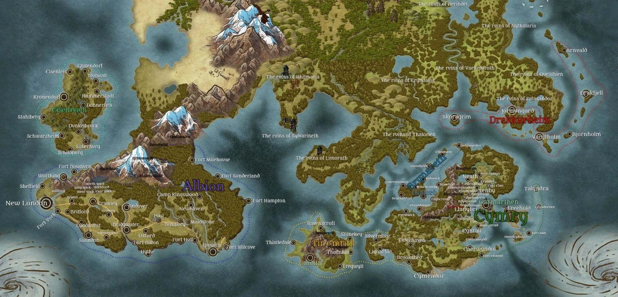 Tir Emrith is a borderland of blended bloodlines and uneasy peace, nestled between the great powers of Cymry and Albion. Rolling hills give way to misty moors, ancient stone circles, and bustling trade roads. Its people are a fusion of Cymric mysticism and Albion pragmatism — merchants, mercenaries, and mystics walking side by side. Though nominally allied with Cymry, Tir Emrith is fiercely independent, known for its silver tongues, skilled diplomats, and a quiet resistance to outside rule. Here, the old gods are whispered to, not worshipped — and every deal carries a deeper meaning. It is a land of crossroads, both literal and spiritual.